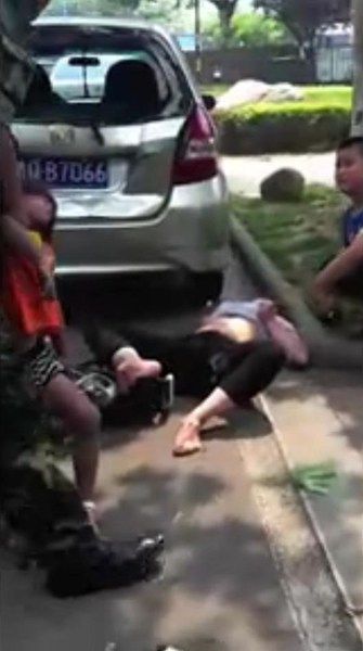 圖為被車撞飛的母女越過(guò)了2輛停在路邊的車,落在了第三輛車的車底下。路人將女童抬出車下,其母躺在一旁。