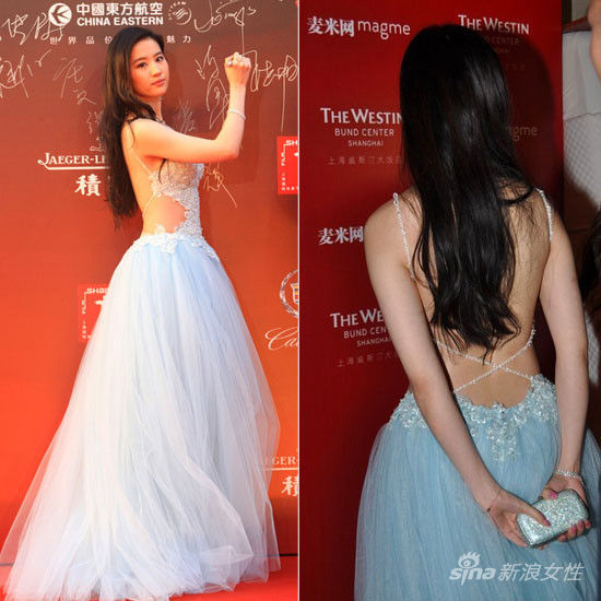 劉亦菲淺藍(lán)水晶蕾絲紗難掩清純氣息,露背裝性感大突破不失玉女風(fēng)范。