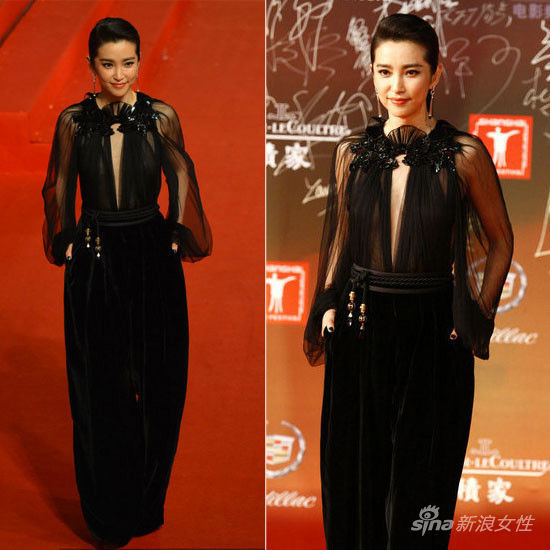 李冰冰身著GUCCI(微博)2012秋冬系列改良款黑色禮服裙亮相。簡(jiǎn)單利落的直發(fā)馬尾,優(yōu)雅不失帥氣感,以簡(jiǎn)單的發(fā)型襯托性感的透視禮服裙,更充滿華麗色彩。