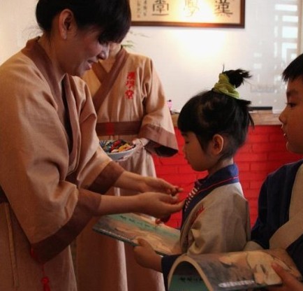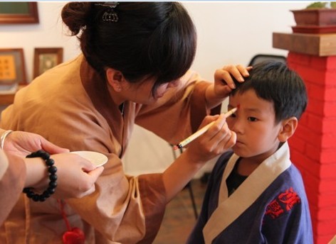 ??? 活動當(dāng)日,在漢學(xué)堂老師的帶領(lǐng)下,身著漢服的小學(xué)員們穿漢服、點(diǎn)朱砂、向孔子拜師、誦讀國學(xué)經(jīng)典……仿古人意,傳承古禮,還原了一場隆重的傳