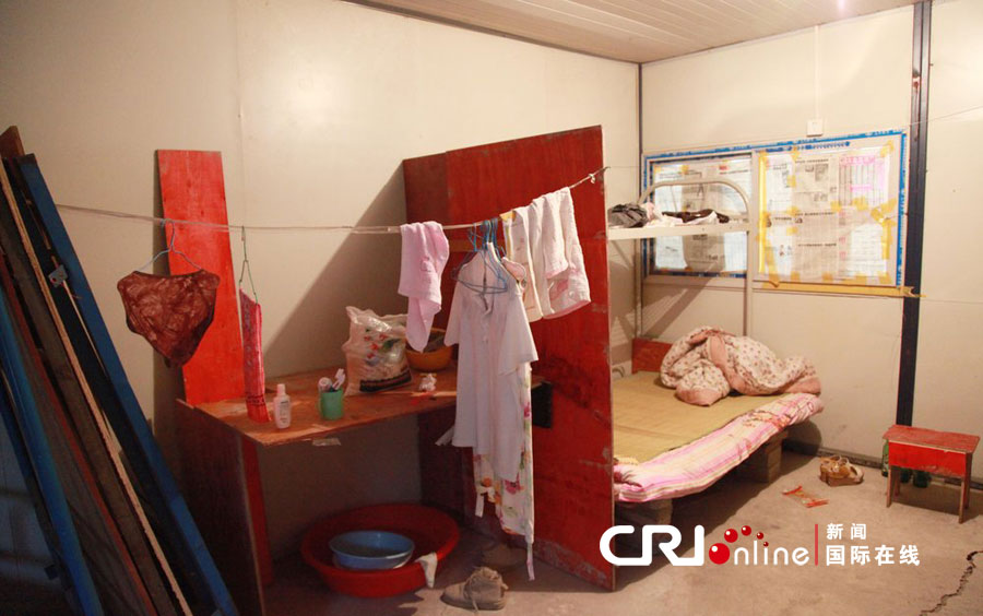 其中一間來自合肥工友的夫妻房,窗戶用報(bào)紙糊著代替窗簾,室內(nèi)拉了一根繩子晾曬衣服,生活用品零散的擺放在夫妻房內(nèi)。