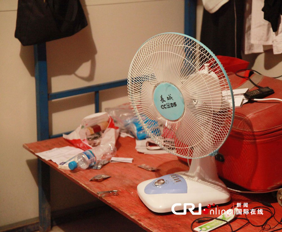 其中一間來自合肥工友的夫妻房,因?yàn)殡娏Σ粔?,無法使用空調(diào),只有用電風(fēng)扇散熱降溫。