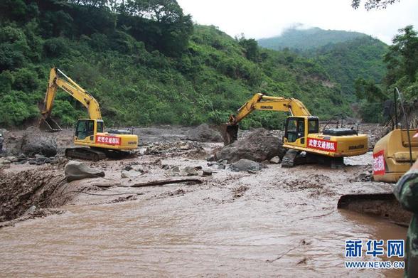 6月28日,搶險人員在四川涼山州寧南縣用機(jī)械搶通被沖毀的道路。