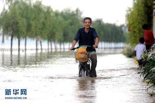 6月28日,廣西柳州市民在被洪水淹沒的濱江路上騎行。