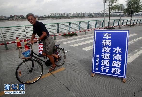 6月28日,廣西柳州柳江邊道路上的警示牌被淹。