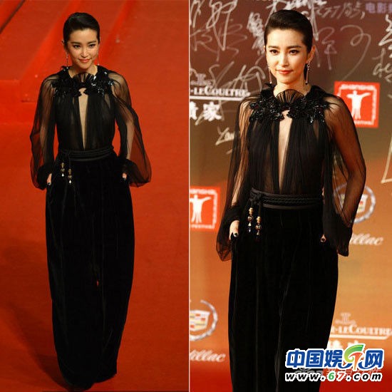 李冰冰身著GUCCI2012秋冬系列改良款黑色禮服裙亮相。簡單利落的直發(fā)馬尾,優(yōu)雅不失帥氣感,以簡單的發(fā)型襯托性感的透視禮服裙,更充滿華麗色彩。