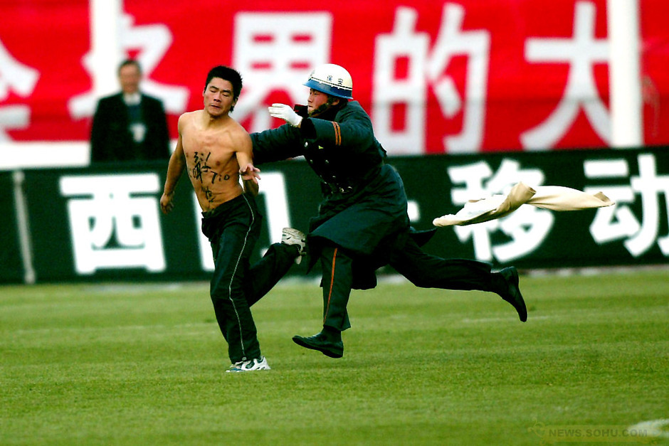 2004年12月11日,山東省體育中心舉行的首屆中超聯(lián)賽杯決賽上,“裸奔”的球迷正被治安人員追趕。當(dāng)日,山東魯能2-0戰(zhàn)勝深圳健力寶,獲得冠軍。外國裸奔球迷司空見慣,這應(yīng)該是穿著最多的“裸露”球迷。