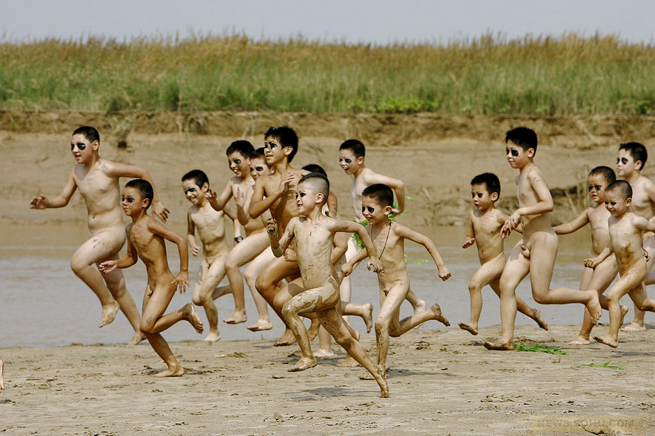 2010年8月6日,河南鄭州市花園口黃河灘地,“熊貓人”趙半狄發(fā)起27名男孩脫衣裸奔的行為藝術(shù)表演。孩子們在黃河邊上一遍遍地奔跑,希望通過努力換來一座孤老院。寄予“裸露”有成效。