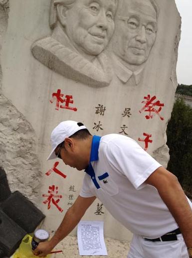 孫子在墓碑上涂漆