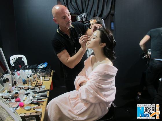 范冰冰巴黎走秀后臺(tái)花絮曝光 披浴袍深V露溝化妝(圖)