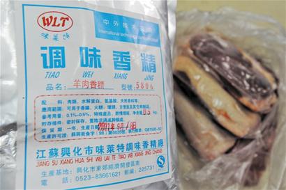 ????買了一部分裝好的鴨胸肉后,根據(jù)肉店老板的指引,記者來到位于肉食區(qū)不遠(yuǎn)的一家調(diào)味品店,記者表示自己是做烤肉生意的,想買些烤肉用的調(diào)料。隨后店主拿出幾個(gè)大大小小的包裝袋,向記者推銷這種燒烤調(diào)料,仔細(xì)觀察記者發(fā)現(xiàn)這些都是普通的烤肉調(diào)味品,使用這些東西顯然無法制作出徐先生口中的羊肉串。“我想把肉串烤的羊肉味重一點(diǎn),有沒有什么好一點(diǎn)的調(diào)料啊?!庇浾咴囂叫缘貑柕健C鎸?duì)記者的問詢,店主顯得有些警惕,但隨后也打消了疑慮,“普通的調(diào)料不行,得用食品添加劑。”店主說完,走進(jìn)店鋪內(nèi)從柜臺(tái)下的一個(gè)塑料袋中拿出一袋食品添加劑。記者看到,店主口中的特殊食品添加劑實(shí)際上就是羊肉香精,“你用這個(gè)就行了,一袋能用很長時(shí)間?!钡昙腋嬖V記者。