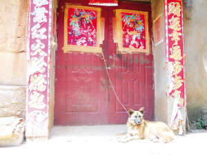 下午2點(diǎn),李國(guó)春家的門緊鎖著,門口的血跡雖已被村民用石灰覆蓋,但仍有不少血跡滲出來(lái)。母子倆養(yǎng)了5年的“老黃”被拴在門閂上,似乎在等待著主人的歸來(lái)。
