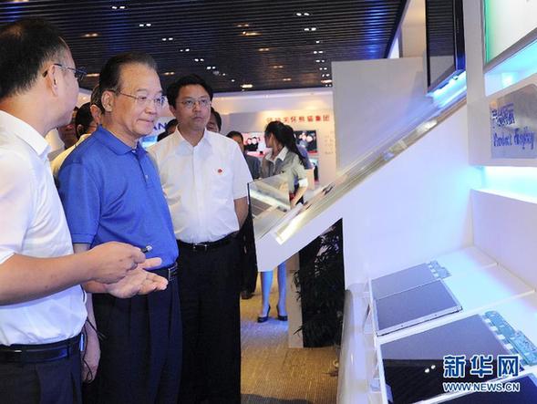 7月6日至8日,中共中央政治局常委、國務(wù)院總理溫家寶來到江蘇省常州、鎮(zhèn)江、南京等地就當前經(jīng)濟形勢進行調(diào)研,并在南京主持召開遼寧、江蘇、浙江、安徽、廣東五省經(jīng)濟形勢座談會。這是7月7日,在中電熊貓液晶顯示科技有限公司產(chǎn)品展廳,溫家寶向企業(yè)負責人詳細詢問企業(yè)平板顯示技術(shù)自主產(chǎn)權(quán)情況。
