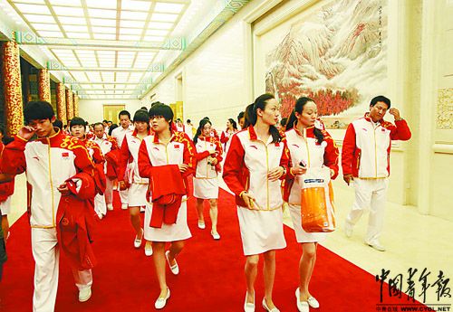 7月10日,參加中國奧運(yùn)代表團(tuán)成立大會(huì)的年輕運(yùn)動(dòng)員走在人民大會(huì)堂里