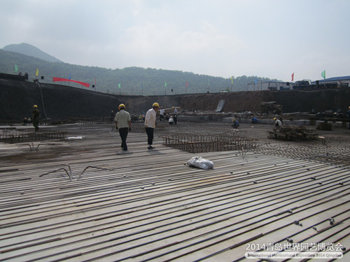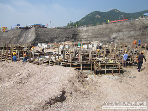 2012年7月11日,主題館A區(qū)防水底板鋼筋綁扎完成20%,C區(qū)地上部分鋼筋綁扎、模板安裝完成60%。主題館自2月19日開工建設(shè),目前已完成基坑開挖及墊層施工,抗浮錨桿完成總工程量的80%,底板防水完成30%,鋼柱腳錨栓預(yù)埋完成10%。