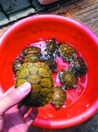 昨天下午,記者先后來到南山市場、團島農(nóng)貿(mào)市場等地,發(fā)現(xiàn)巴西龜?shù)让髁罱逛N售的外來物種被擺在路邊銷售。在南山市場附近,短短數(shù)十米的街道邊,就有3處巴西龜?shù)氖圪u點。攤主說:“這小東西賣得很火,最開始是從國外引進的,現(xiàn)在在國內(nèi)就能繁殖了,一只才18元。很多人都到我這來買。 ”