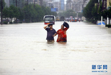 7月13日,行人在武漢積水嚴(yán)重的街道涉水而行。