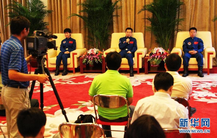 隔離期間,中國航天員科研訓練中心本著恢復措施與醫(yī)學檢查有機結合的原則,開展了動態(tài)醫(yī)學檢查與評估、心理和體質恢復訓練、作息制度調(diào)整、合理營養(yǎng)調(diào)配、消毒檢疫等5個方面的醫(yī)監(jiān)醫(yī)保工作。通過14天的觀察,證明隔離恢復措施合理、效果明顯。目前,3名航天員重力再適應進展順利,各項生理指標正常。圖為7月13日,航天員景海鵬(中)、劉旺(右)、劉洋在北京航天城航天員公寓與媒體見面。