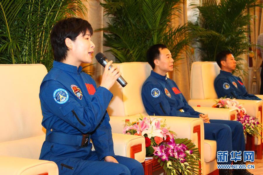 7月13日,航天員劉洋在北京航天城航天員公寓回答媒體記者提問。