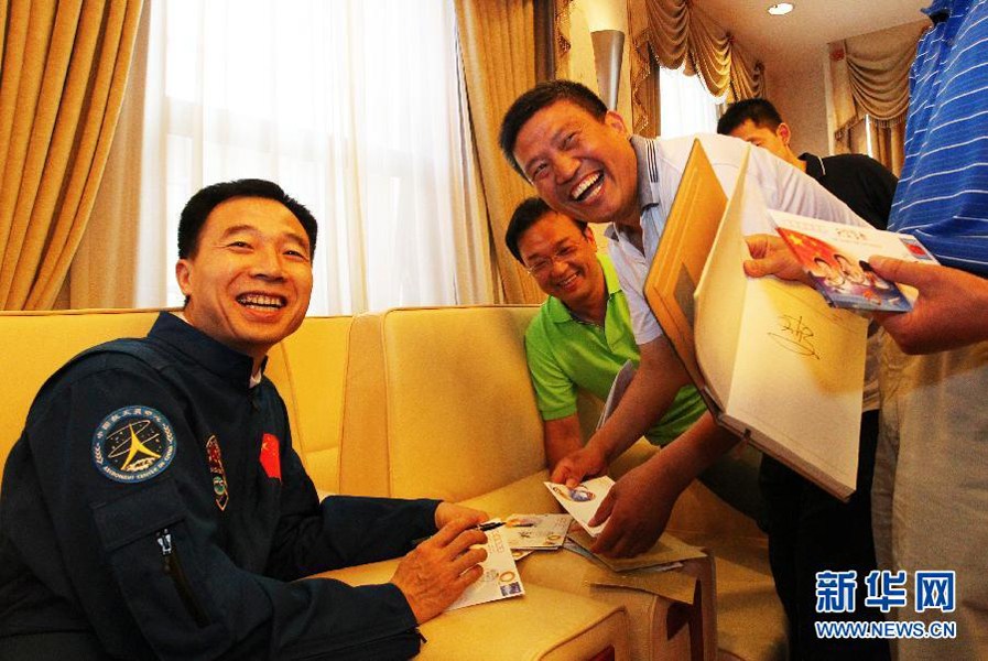 7月13日,航天員景海鵬為媒體記者在紀念封上簽名。