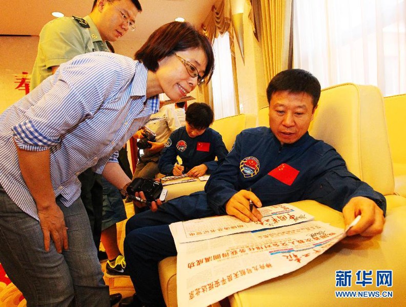 7月13日,航天員劉旺為媒體記者簽名。