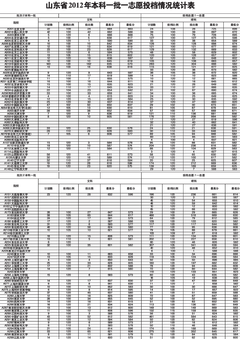 山東省2012年本科一批一志愿投檔情況統(tǒng)計(jì)表(1)