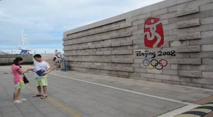 游客參觀奧運(yùn)紀(jì)念墻