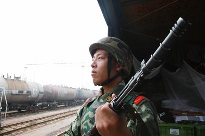 按照火車的調(diào)度,火車需要編組,每次編組短則兩三個(gè)小時(shí),長則七八個(gè)小時(shí),此時(shí)武警戰(zhàn)士開始執(zhí)勤巡守?;疖嚨郎系臍鉁赜?0℃,而車廂內(nèi)的溫度卻高達(dá)50℃,戰(zhàn)士們?nèi)蔽溲b在悶罐車?yán)锔叨染?,?yán)防各種意外。