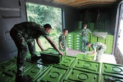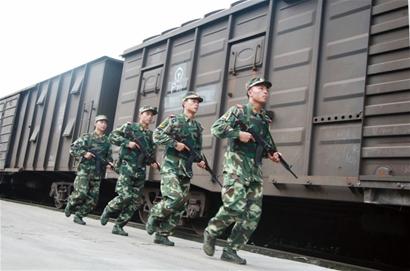 “咣當(dāng)”一聲,7月16日下午,隨著車廂門砰然關(guān)閉,武警官兵開始了長達(dá)3天3夜的押運(yùn)生活。戰(zhàn)士們個(gè)個(gè)全副武裝,頭戴鋼盔,身穿防彈衣,手持重武器。站不穩(wěn)又坐不下的武警戰(zhàn)士,只能半靠在箱子上面。火車不停地?fù)u晃,箱子一會(huì)兒移開,一會(huì)兒又?jǐn)D撞在一起,手臂貼在上面,一不小心就被夾住一塊皮肉,有時(shí)火車一個(gè)急轉(zhuǎn)彎,巨大的慣性作用下,頂層的箱子就飛下來,稍不留神就得“掛彩”。夜色漸漸拉下了帷幕,火車轟隆隆地行進(jìn),車輪摩擦著鐵軌發(fā)出“咔嚓咔嚓”的聲音。透過通風(fēng)孔看去,外面漆黑一片,除了站臺(tái)上呼嘯而過的燈火什么都看不到,耳邊是轟鳴的火車開動(dòng)聲,身上是前仆后繼的蚊子大軍。
