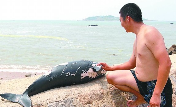 ????19日10時(shí)許,尚先生跟朋友在極地海洋世界西南側(cè)海邊垂釣時(shí),突然發(fā)現(xiàn)距離岸邊數(shù)十米遠(yuǎn)的海面上漂浮著一條黑色“大魚”。尚先生涉險(xiǎn)下海將其撈起來,發(fā)現(xiàn)是一條體表傷痕累累的已死亡的小江豚。