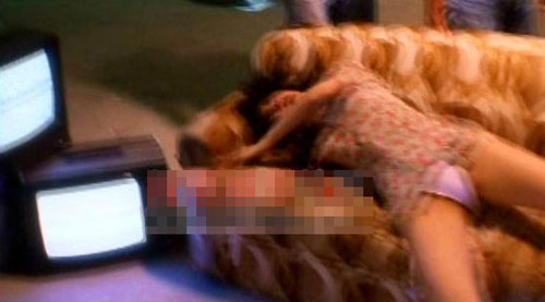 《古惑仔之只手遮天》劇照。鄭伊健的女友,被張耀揚抓住,先奸后殺,劇照為被殺前夕的反抗。