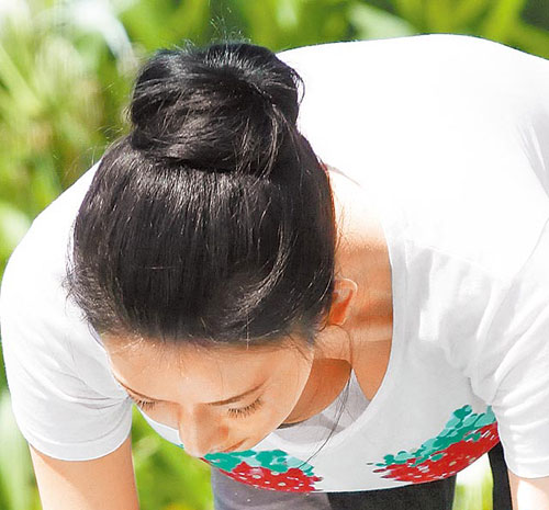 林志玲日前在三亞為新片彎腰練瑜伽