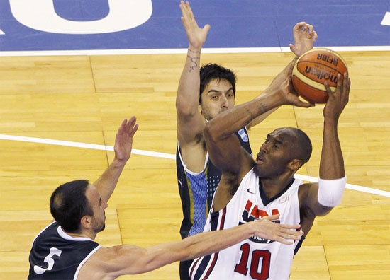 ????進(jìn)入第三節(jié)美國(guó)隊(duì)重新發(fā)力,杜蘭特與科比又是接連遠(yuǎn)投建功,詹姆斯隨之表演近籃轉(zhuǎn)身打三分,美國(guó)隊(duì)54-40拉開比分。吉諾比利此后連入遠(yuǎn)投帶動(dòng)阿根廷漲分,妖刀也對(duì)詹姆斯使出了摟脖犯規(guī)的大動(dòng)作;但杜蘭特延續(xù)三分球火力仍率美國(guó)隊(duì)69-49重建20分優(yōu)勢(shì)。