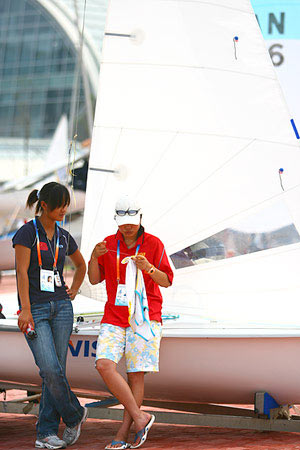 ???? 2006年8月28日,今天的海面依然有霧,能見度很低。早上混合區(qū)開放過程中,中國隊(duì)員神態(tài)輕松。在做好必要的帆船檢查后,中國女子470級(jí)選手王曉麗自己縫起了脫線的衣服。