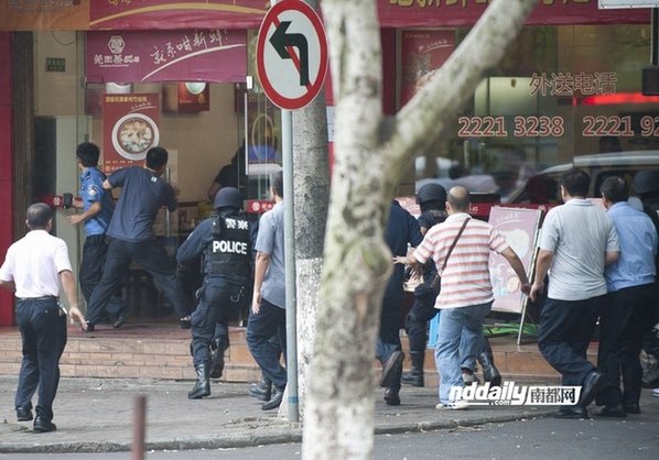 據(jù)莞園餐廳的員工說(shuō),當(dāng)時(shí)餐廳里共有7個(gè)人,其中一對(duì)母女正在餐廳中間的桌子上吃飯,其余的則是餐廳的員工?!皺M條衫男子沖進(jìn)來(lái)之后,直接將手中的工具啪的一聲放在桌子上,尖尖的那頭對(duì)著五六歲大的小女孩,嚇得母女倆動(dòng)也不敢動(dòng)”,員工們見(jiàn)狀立即跑了出來(lái)“這個(gè)過(guò)程男子沒(méi)有說(shuō)任何話,也沒(méi)提任何要求,只是望著母女倆。”