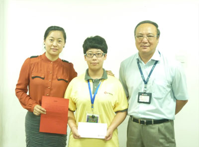 受表彰者合影(右一,京港地鐵運(yùn)營(yíng)副總經(jīng)理郭初光;中間,易才員工張娜;左一,易才公共服務(wù)事業(yè)部總經(jīng)理張秋利)
