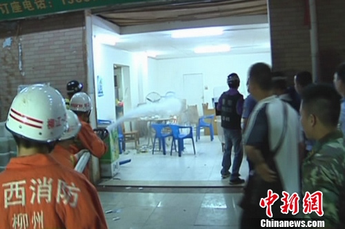 柳江縣消防大隊介紹,7月23日20時30分,柳江縣商貿(mào)街一處居民房內(nèi),柳江縣公安局民警在對一名在家中販毒的男子實施抓捕時,男子突然持菜刀拒捕,并逃跑至樓下的宵夜店中與