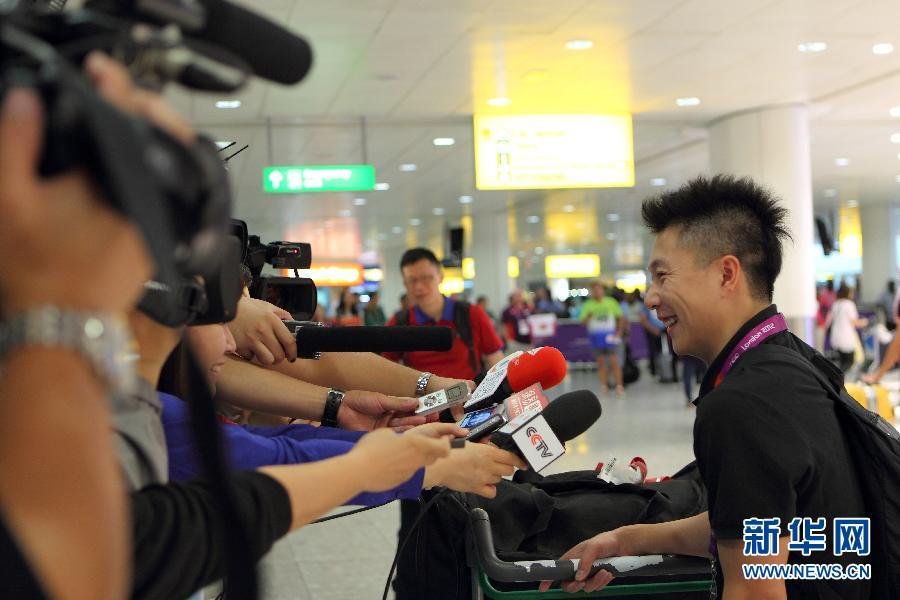 北京時(shí)間7月25日,姚明走出倫敦希斯羅機(jī)場(chǎng)后接受鮮花。 當(dāng)日,姚明、郎平、李小鵬等與中國(guó)體育代表團(tuán)團(tuán)部一行抵達(dá)倫敦希斯羅機(jī)場(chǎng)。