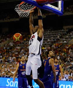 ????第二節(jié),加索爾率先得分,杜蘭特兩罰一中,隨后安東尼斜刺里殺出,胡了一把“大三元”(三分命中),詹姆斯三分球再中,美國隊以28-26反超。加索爾強攻內(nèi)線制造罰球,兩罰全中,安東尼接應詹姆斯無眼傳球,然后溜底放籃輕取2分,紐約核心一發(fā)不可收拾,三分球還有,罰球兩罰全中,隨后他又助攻詹姆斯命中三分,一個12-2的得分高潮之后,美國隊42-32領先達到兩位數(shù)。美國隊加強了防守,西班牙進攻陷入混亂,科比上演精彩爆扣,半場美國隊以48-40領先。安東尼得到全隊最高分23分。