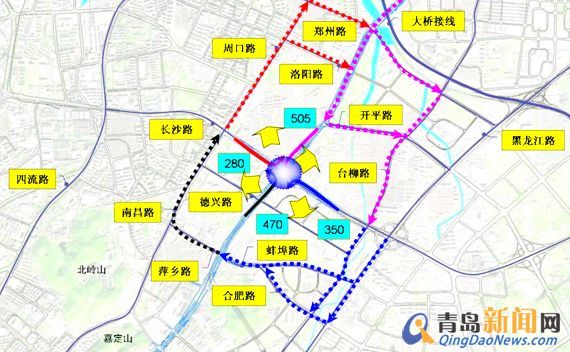 四方區(qū)的長沙路路口作為區(qū)域主要節(jié)點(diǎn),取消重慶南路兩個(gè)方向的左轉(zhuǎn)功能,以保證重慶路主線的直行交通需要,左轉(zhuǎn)車輛通過周邊道路繞行。主要采取以下交通管理措施:北向東左轉(zhuǎn)可經(jīng)新建鄭州路、開平路-臺柳路繞行;南向西左轉(zhuǎn)可經(jīng)萍鄉(xiāng)路-南昌路繞行。另外,為減少交通壓力,長沙路東西方向的左轉(zhuǎn)彎車輛也可以提前由以下道路繞行:東向南左轉(zhuǎn)可經(jīng)臺柳路、黑龍江路-蚌埠路、合肥路繞行;西向北左轉(zhuǎn)可經(jīng)周口路-洛陽路、鄭州路繞行。