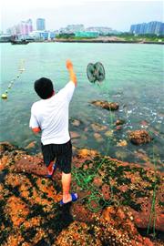 進入夏季以來,不少喜歡海釣的市民又坐不住了,紛紛出來趕海。他們瞄準的不是小魚小蝦,而是美味螃蟹——“石夾紅”。螃蟹籠里裝上雞腸子或者割碎的鮐鲅,然后投到合適的地方,便可吸引藏匿在礁石里的石夾紅螃蟹入籠。近日,記者探訪前海適合釣螃蟹的幾個地方時了解到,在前海釣螃蟹的市民有時達近百人。有的市民一天能釣上七八斤螃蟹,也有的市民一連扔下三個螃蟹籠都被石頭卡住有去無回,但依然樂在其中。