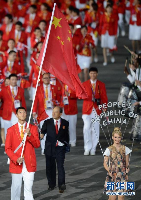 7月27日,第三十屆夏季奧林匹克運(yùn)動(dòng)會(huì)開幕式在倫敦奧林匹克公園主體育場(chǎng)“倫敦碗”舉行。這是中國代表團(tuán)旗手易建聯(lián)(左前)執(zhí)旗入場(chǎng)。