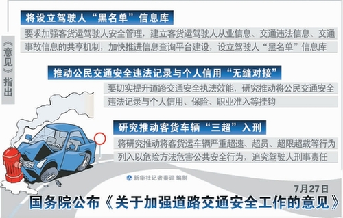 ????記者7月27日從中國政府網(wǎng)獲悉,國務(wù)院日前發(fā)布關(guān)于加強(qiáng)道路交通安全工作的意見,要求加強(qiáng)客貨運(yùn)駕駛?cè)税踩芾?,建立客貨運(yùn)駕駛?cè)藦臉I(yè)信息、交通違法信息、交通事故信息的共享機(jī)制,加快推進(jìn)信息查詢平臺(tái)建設(shè),設(shè)立駕駛?cè)恕昂诿麊巍毙畔臁R庖娭赋?,將研究推?dòng)將客貨運(yùn)車輛嚴(yán)重超速、超員、超限超載等行為列入以危險(xiǎn)方法危害公共安全行為,追究駕駛?cè)诵淌仑?zé)任。