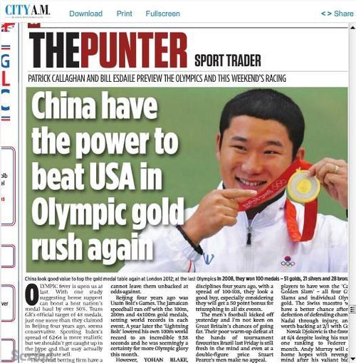 ????在7月27日的報(bào)紙中,他們對(duì)中國(guó)繼續(xù)保持奧運(yùn)會(huì)金牌榜第一給出了積極的推薦,但遺憾的是,旁