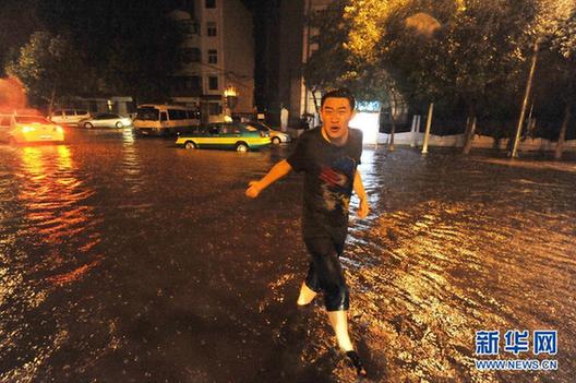 7月30日,在寧夏銀川城區(qū)內(nèi),一位路人從水中走過。