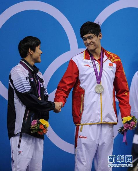 7月30日,中國選手孫楊(右)在頒獎儀式上。當(dāng)日,在倫敦奧運(yùn)會男子200米自由泳決賽中,中國選手孫楊和韓國選手樸泰桓以1分44秒93的成績獲得并列亞軍。