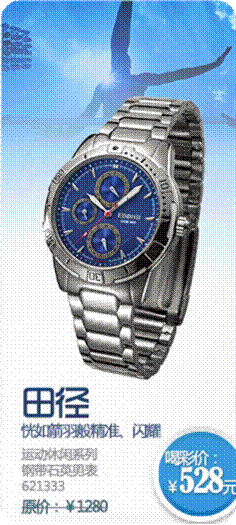 ??? 運(yùn)動(dòng)休閑系列-鋼帶石英男表621333是本次活動(dòng)的田徑主打款產(chǎn)品。該表采用藍(lán)色圓形表盤,三眼設(shè)計(jì),箭頭刻度,紅色秒針分外搶眼,外表盤專為運(yùn)動(dòng)設(shè)計(jì)的60秒刻度盤動(dòng)感十足,無愧于專為運(yùn)動(dòng)休閑設(shè)計(jì)的表款。目前,該款腕表奧運(yùn)喝彩價(jià)為528元,大約為原價(jià)1280元的4折。
