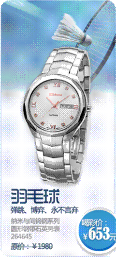 ??? 納米與間鎢鋼系列-圓形鋼帶石英男表264645是本次活動(dòng)的羽毛球主打款產(chǎn)品。純白色圓形表盤簡(jiǎn)潔干凈,玫瑰金色指針、羅馬數(shù)字刻度、藍(lán)寶石表鏡無處不透著高雅大方,菱形外表盤及表帶設(shè)計(jì)棱角分明,作為納米與間鎢鋼系列的經(jīng)典表款,高科技耐磨損納米鍍層及超硬耐磨鎢鋼表圈是其品質(zhì)的保障和個(gè)性的彰顯。目前,該款腕表奧運(yùn)喝彩價(jià)為653元,原價(jià)為1980元,是本次活動(dòng)折扣力度最大的表款。