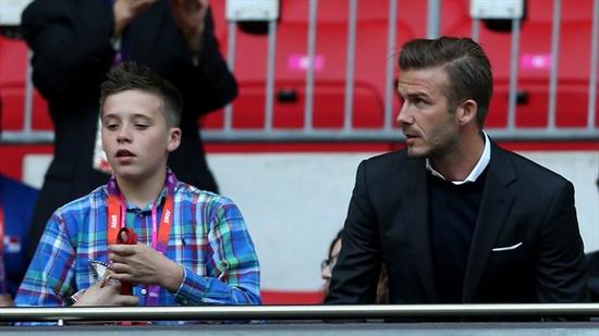 貝克漢姆與他的兒子布魯克林出現(xiàn)在溫布利大球場(chǎng)。球星貝克漢姆與他的兒子布魯克林,在男子足球小組賽英國(guó)隊(duì)VS阿聯(lián)酋之間的比賽現(xiàn)場(chǎng)。