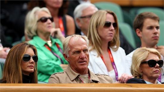 高爾夫球員格雷格·諾曼在溫布爾登觀看男子網(wǎng)球單打比賽。澳大利亞球手格雷格·諾曼和他的妻子庫特納爾,觀看在溫布爾登舉行的安迪·穆雷和瓦林卡斯坦尼斯之間的奧運(yùn)網(wǎng)球男單比賽。